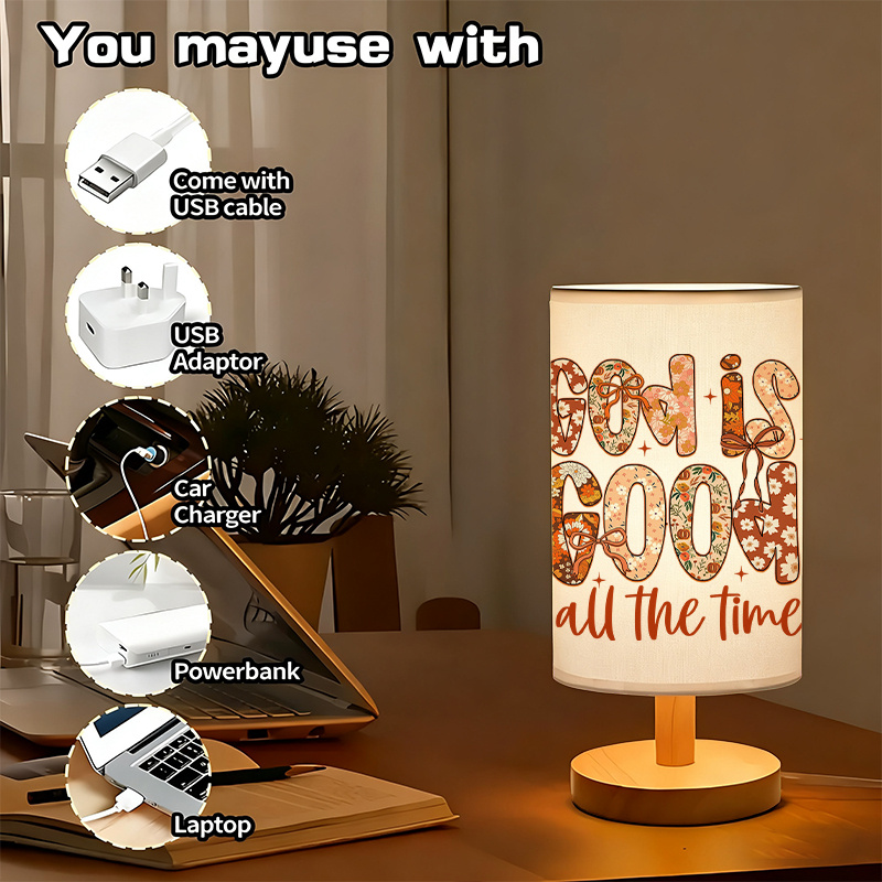 Linen Table Lamp combines a modern tabletop silhouette with a printed “God Is Good all the time” quote design that stands out in bedrooms, living rooms, study spaces, and reading corners. The cylindrical linen shade keeps the artwork visible as décor, while the uplight lighting method helps distribute light in a gentle, even way across nearby surfaces. With push button control, a compact base, and a cable-powered setup, this lamp works as both a practical lighting option and a décor accent for everyday indoor spaces.