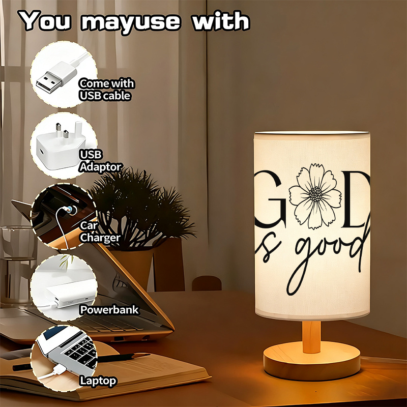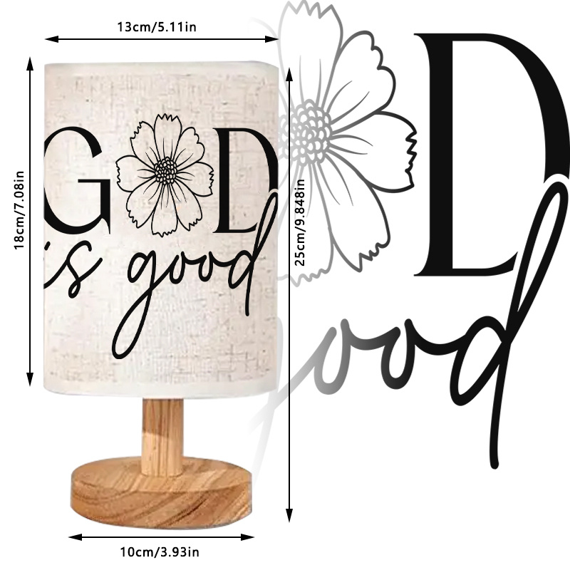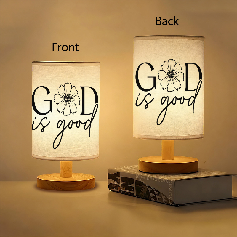 This God Is Good Quote With Floral Design Printed Table Lamp brings a message-inspired design into your home or personal space. Designed with both practical and decorative intentions, it works well on tables, desks, or shelves. Featuring a wooden base and fabric shade, this lamp supports small-space lighting needs without requiring wall installations or battery swaps.