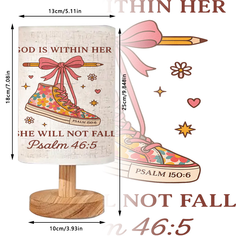 The God Is Within Her Printed Linen Table Lamp With Shoe Design is a beautiful USB-powered linen table lamp that offers both practical lighting and an inspiring message. Featuring the empowering phrase "God is within her, she will not fall" from Psalm 46:5, this lamp serves as a reminder of strength and faith. With a vibrant design of a colorful sneaker adorned with flowers and a ribbon, this lamp makes a meaningful addition to any space. Whether placed in a bedroom, office, or study room, this lamp brings light and encouragement.