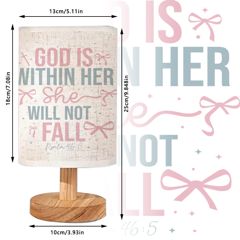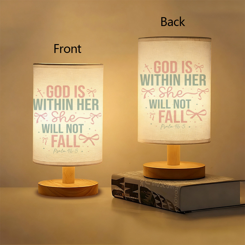The God Is Within Her She Will Not Fall Faith Message Printed Linen Table Lamp is created for seasonal settings that favor warm lighting, thematic design, and structured materials. This lamp features a cylindrical printed shade and a balanced wood base, designed to remain upright and functional across various spaces.