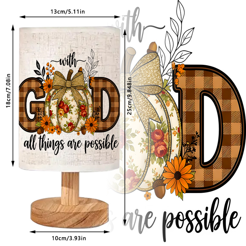 Add warmth and inspiration to your home this fall with the God Printed Linen Table Lamp With Autumn Inspired Pumpkin. The lamp's beautifully detailed pumpkin design, paired with vibrant flowers and a plaid bow, captures the essence of the fall season. The uplifting message, "With God, all things are possible," makes it more than just a source of light—it’s a reminder of faith and hope. USB-powered for convenience, this lamp is easy to place and use anywhere, whether plugged into a USB adapter, power bank, or car charger. Its warm, diffused light creates a welcoming atmosphere in any room, whether you’re using it as a nightlight in the bedroom or as an accent piece in the living room. Perfect for fall gatherings or as a decorative look, this lamp brings both beauty and meaning to your home. Add it to your space and enjoy the cozy, fall-inspired ambiance.