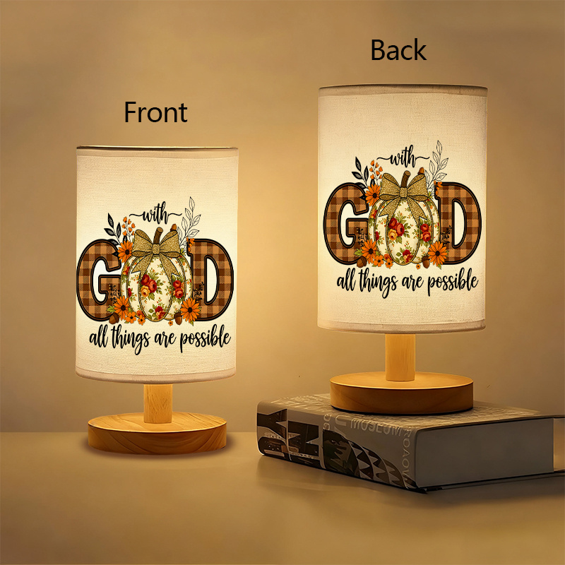 The God Printed Linen Table Lamp With Autumn Inspired Pumpkin combines fall-inspired design with functionality. Featuring a pumpkin design and the phrase "With God, all things are possible," this USB-powered lamp creates a cozy ambiance. Ideal for living rooms, bedrooms, or offices, it’s perfect for fall decor. The linen shade offers soft lighting, and the motivational message adds an uplifting look to your home.