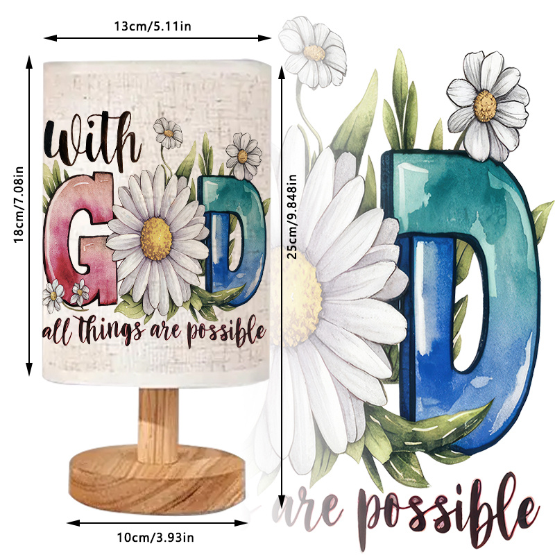 The God Printed Linen Table Lamp With Floral Design For Decor is designed to bring encouragement, warmth, and gentle illumination into your living space. Featuring a beautifully illustrated floral design paired with the inspirational phrase “With God All Things Are Possible,” this lamp adds both visual charm and spiritual meaning to your décor. The linen fabric shade softens the light, creating a calming glow that supports chilling and reflection. With a natural wooden base and convenient USB-powered design, this lamp fits seamlessly into modern homes while carrying a timeless message of faith.