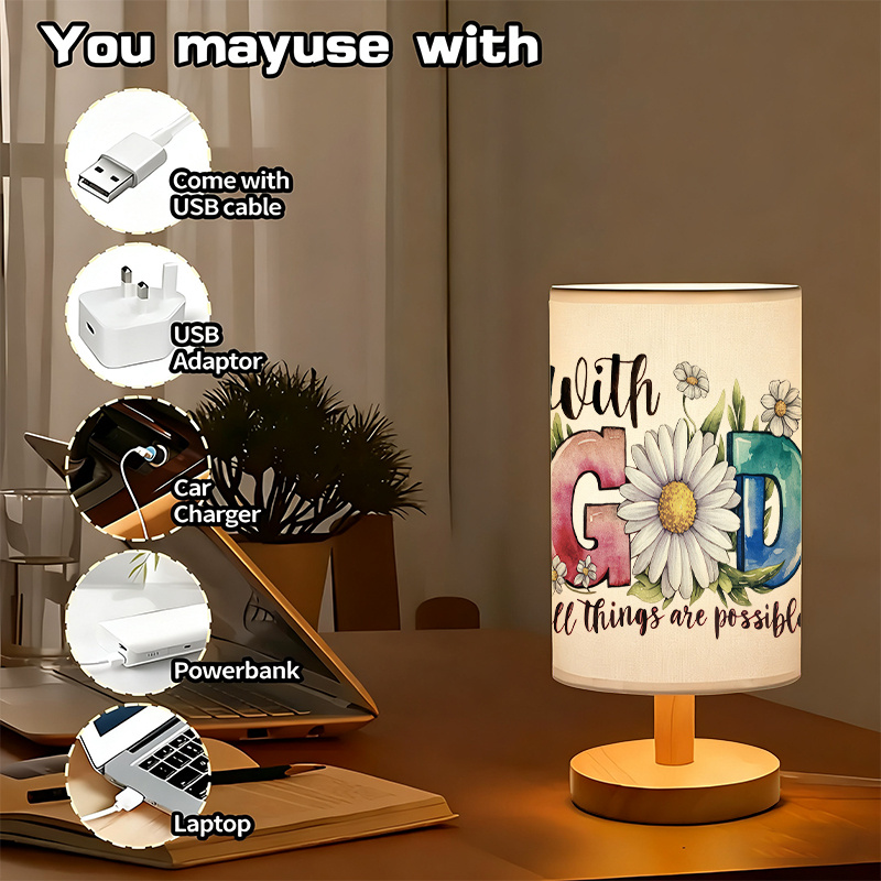 The God Printed Linen Table Lamp With Floral Design For Decor features a linen fabric shade with floral artwork and an inspirational faith message. USB powered for flexible placement, it provides soft ambient lighting for bedrooms, prayer spaces, and living areas. Its wooden base and compact design make it both practical and decorative.