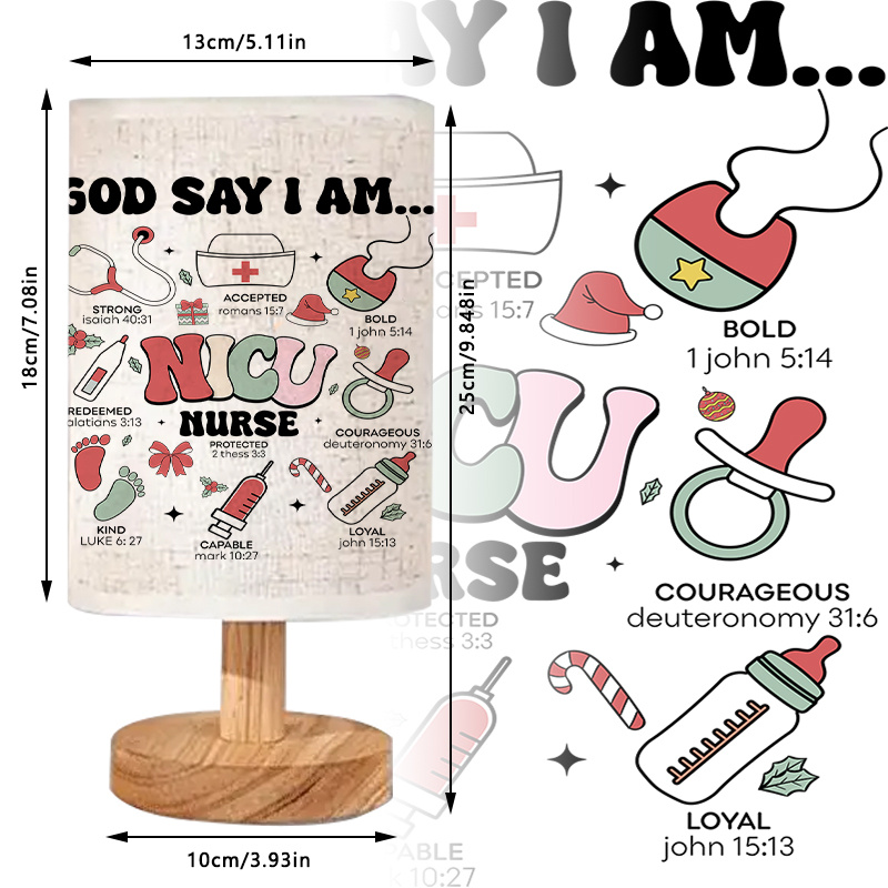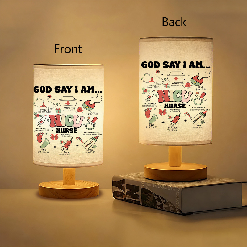 The Modern Linen Table Lamp is an indoor table lighting piece with a linen-style shade featuring “God Say I Am..” and “NICU” text with icon graphics. It supports uplight illumination for balanced room lighting, includes a light source, and uses a button switch with push-button control for straightforward operation. Designed for placement on desks, side tables, shelves, and consoles, it fits a variety of indoor spaces while adding a printed design element to the room.