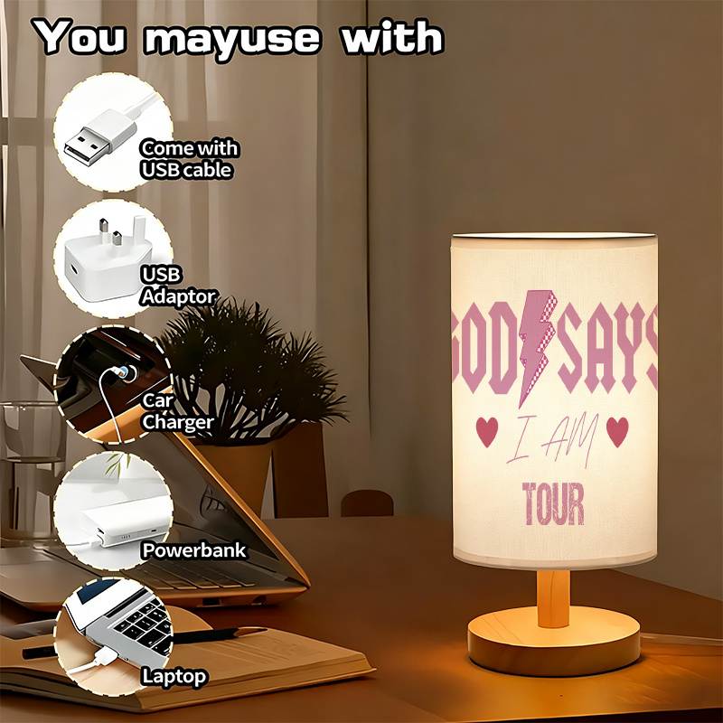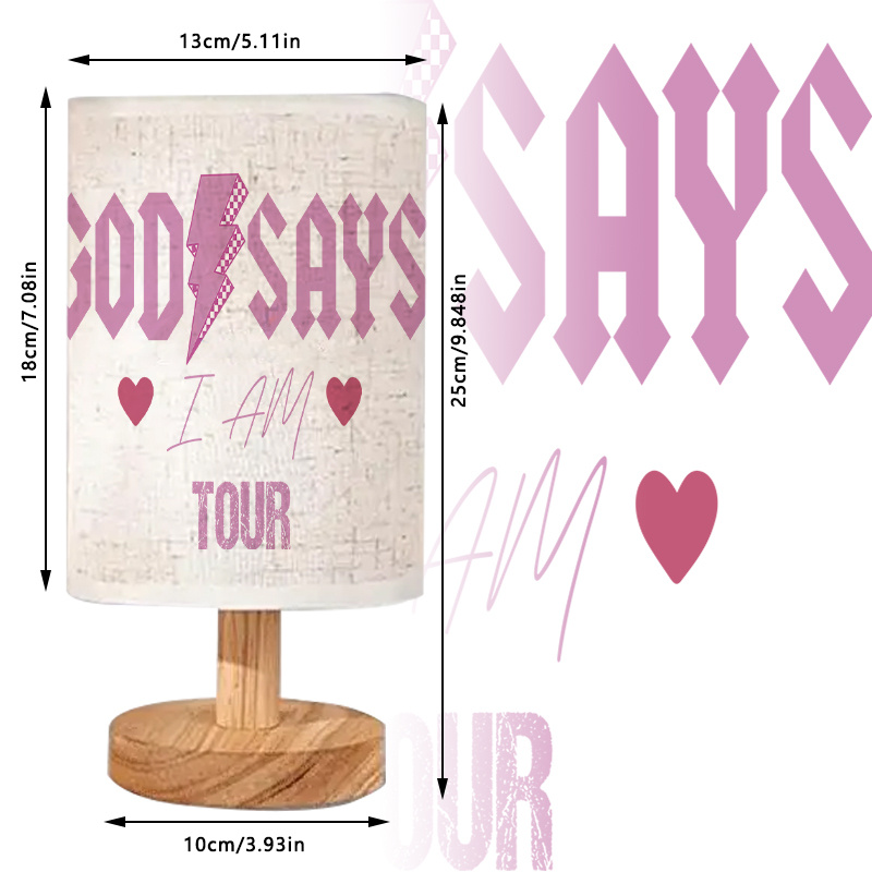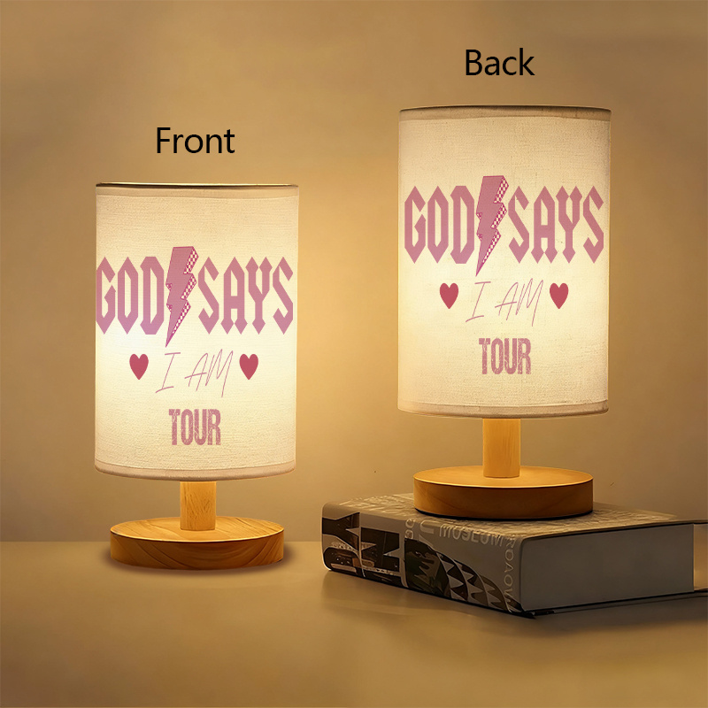 The God Says I Am Tour Inspirational Printed Table Lamp With Lightning Icon Artwork offers a combination of structured visual design and functional lighting. Created to bring a symbolic message into any personal space, it integrates bold typography with themed visual artwork, making it more than just a lighting fixture. Its presence adds a layer of expressive detail to tables, desks, and creative areas.