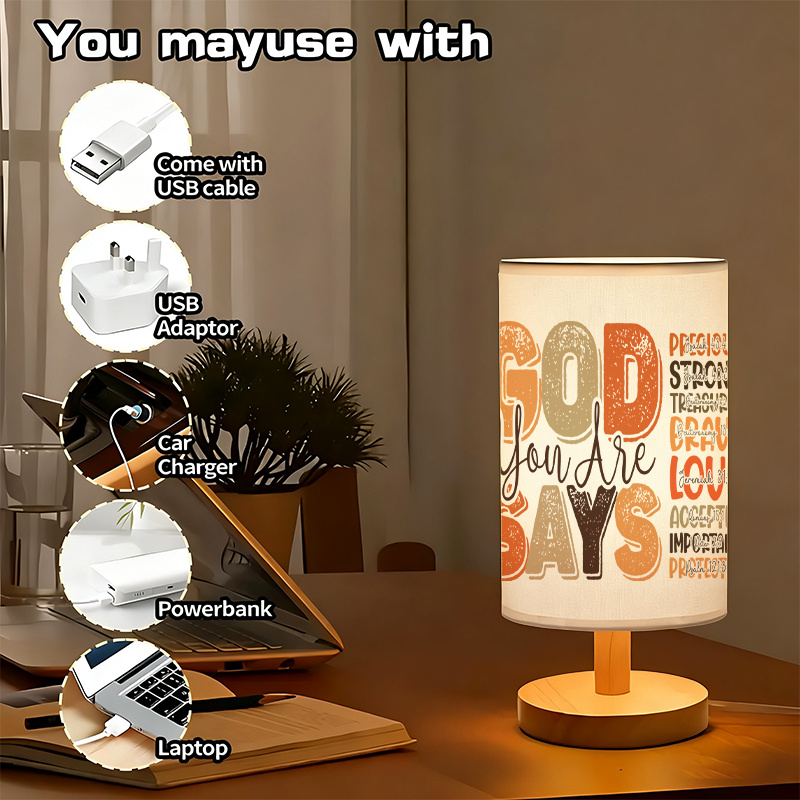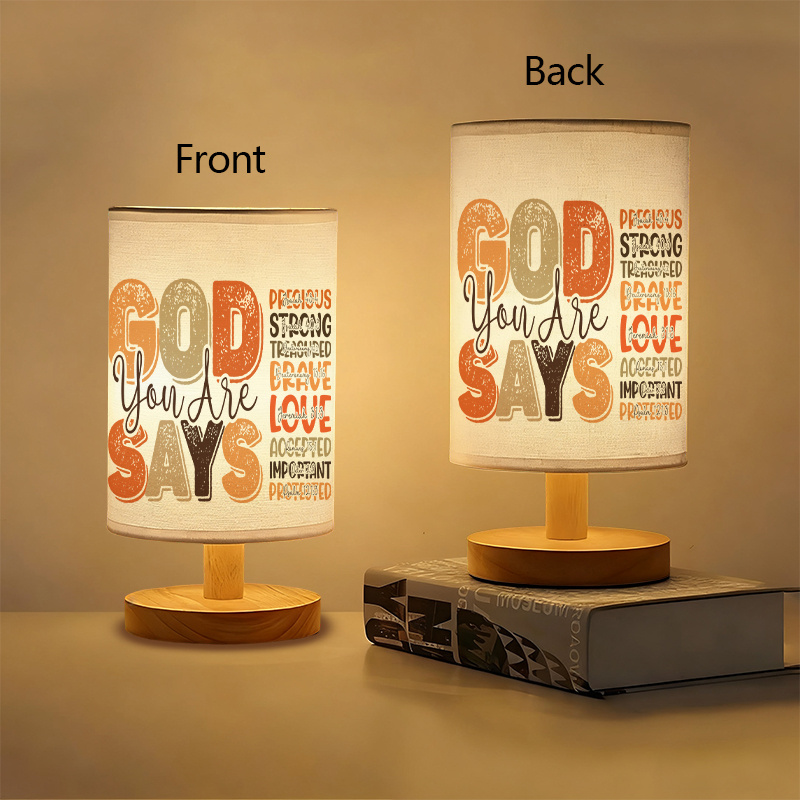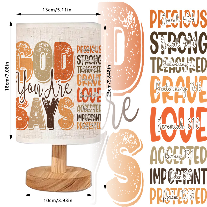 The God Says You Are Faith Message Printed Linen Table Lamp is created for seasonal settings that favor warm lighting, thematic design, and structured materials. This lamp features a cylindrical printed shade and a balanced wood base, designed to remain upright and functional across various spaces.