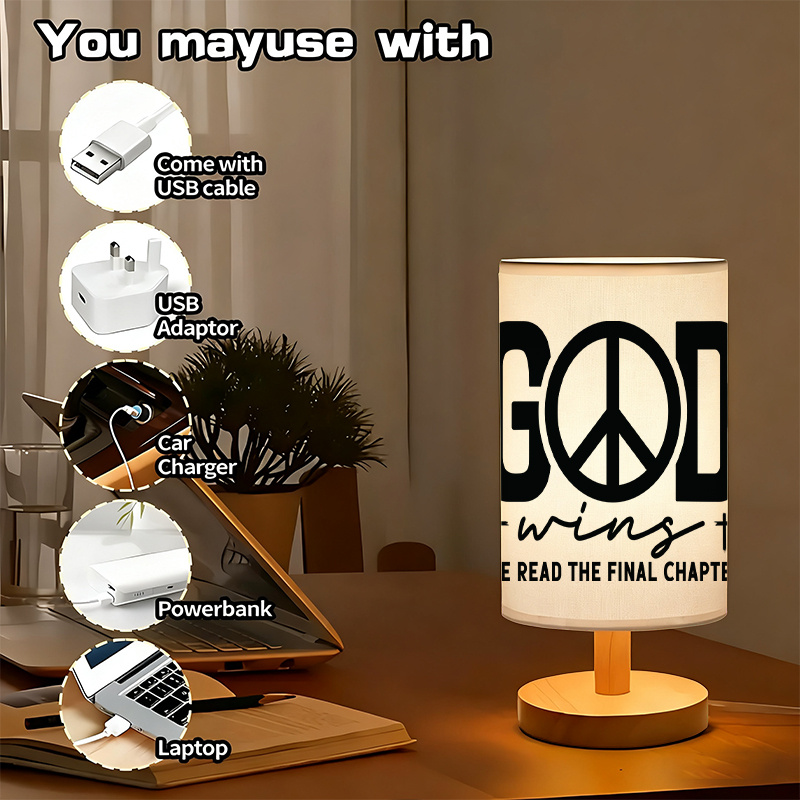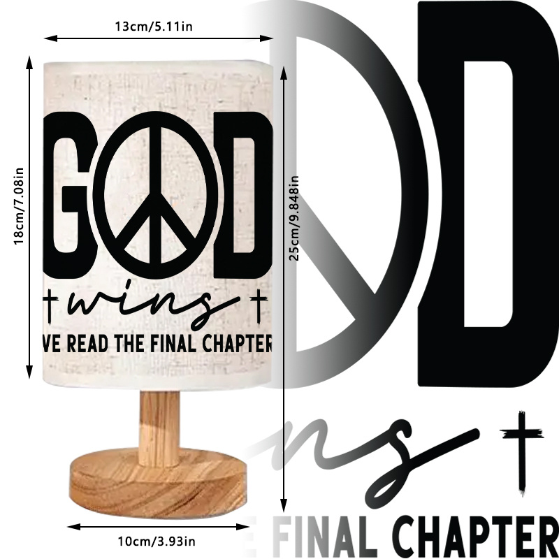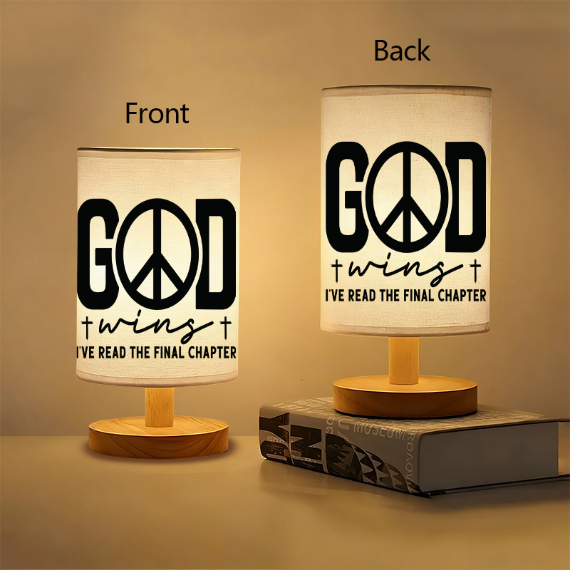 This God Wins Printed Linen Table Lamp provides functional lighting with a design centered around a scripture message. Intended for compact surfaces, the lamp blends simplicity and theme. Whether you place it on a desk, shelf, or tabletop, its scale and form support daily use in various settings.