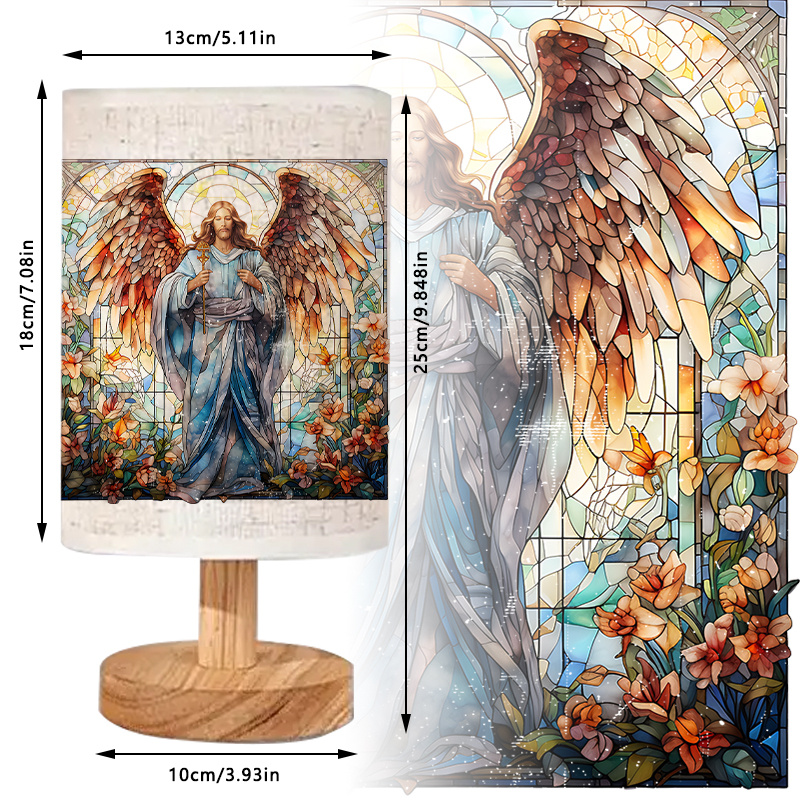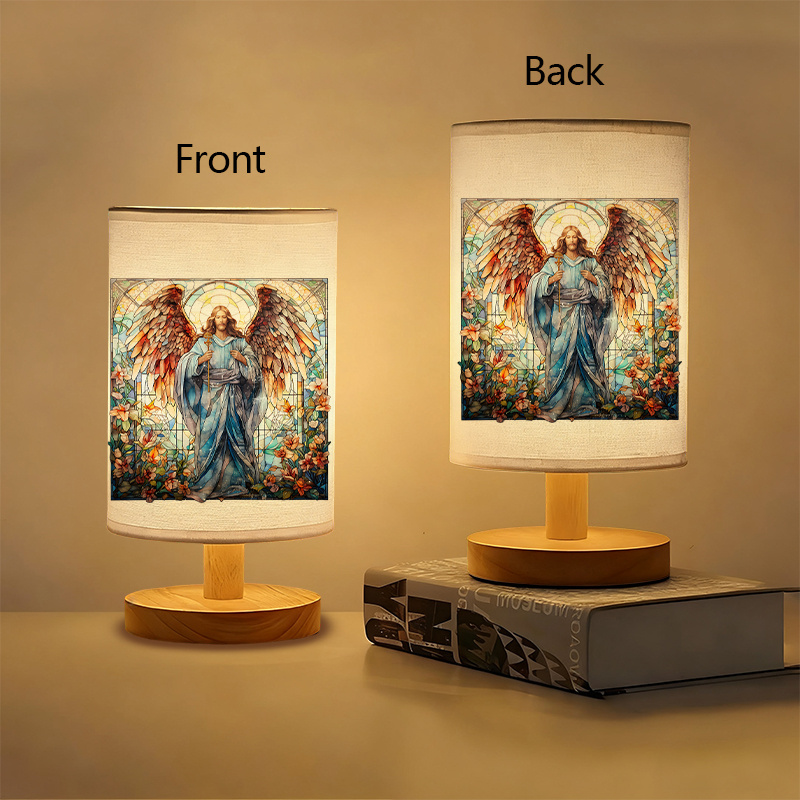 This Guardian Angel Printed Stained Glass Table Lamp with Wooden Base features a compact design that suits indoor surfaces where ambient lighting is preferred. The structure combines a solid wood base with a printed fabric shade showcasing a stained glass–inspired visual. The result is a calm, softly lit presentation that adds interest to table arrangements.