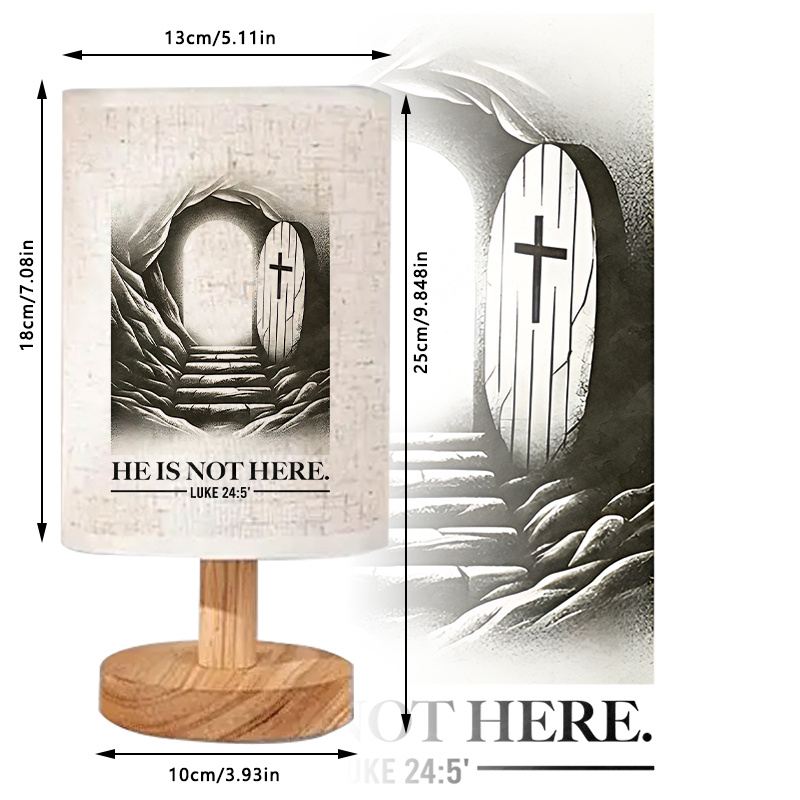 This He Is Not Here Printed Linen Table Lamp For Decor featuring the message "He Is Not Here" from Luke 24:5 is an inspirational piece that brings both warmth and meaning into your home. With its beautiful depiction of the empty tomb and a cross in the design, this lamp serves as a constant reminder of hope, resurrection, and faith. Powered by USB, it provides practical lighting while enhancing the decor of your living room, bedroom, or study.