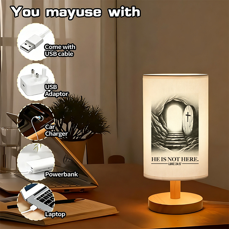 This He Is Not Here Printed Linen Table Lamp For Decor featuring the message "He Is Not Here" from Luke 24:5 is a meaningful and inspirational piece for any room. USB-powered and with a linen shade, it provides a soft, ambient light while offering spiritual inspiration. Perfect for bedrooms, living rooms, or as a thoughtful gift, this lamp serves as both a decorative and functional addition to your space.
