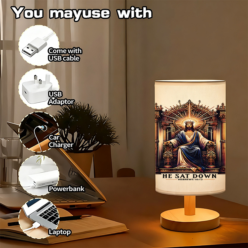 The He Sat Down Printed Linen Table Lamp With Artwork Design offers a perfect blend of spiritual inspiration and stylish design. This USB-powered linen table lamp features an artistic representation of Jesus with the phrase "He Sat Down" from Hebrews 10:12. The elegant and timeless design provides not only light but also spiritual encouragement. This lamp makes a beautiful addition to any room, offering a peaceful and motivational atmosphere, whether used in a bedroom, living room, or study area.