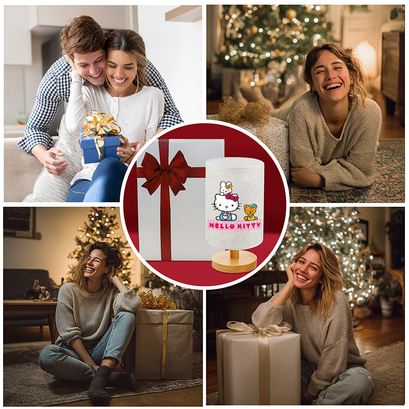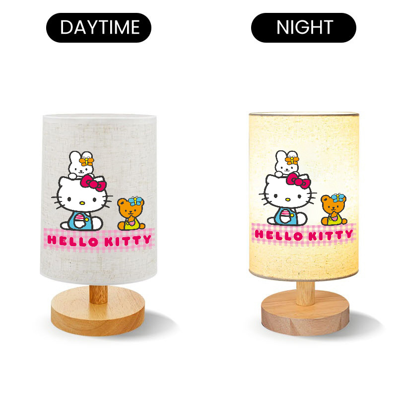 The linen fabric shade gently diffuses light, creating a soothing atmosphere. When illuminated, the Hello Kitty design appears soft and inviting, making it ideal for night lighting, reading, or chilling. The natural wooden base provides a stable foundation while adding a warm, minimalist element that complements modern and cozy interiors alike.