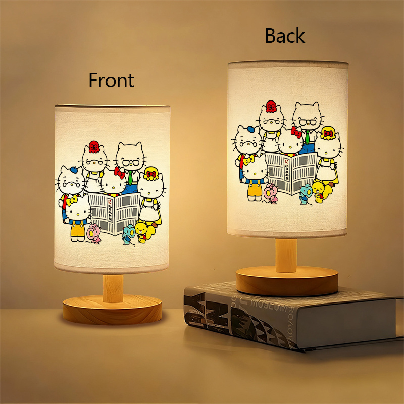 Create a calm and organized atmosphere with the Hello Kitty Family Reading Scene Printed Table Lamp, designed with a charming reading scene illustration. This product features a printed fabric shade supported by a stable wooden base. The visual theme includes multiple cartoon figures arranged around a reading activity, offering a sense of structure through simple artwork.