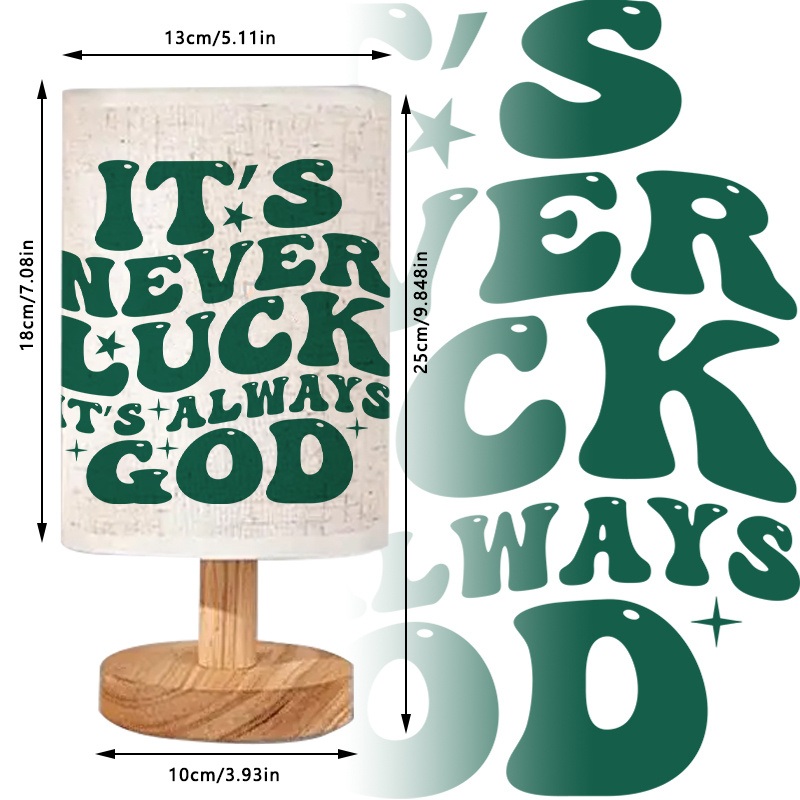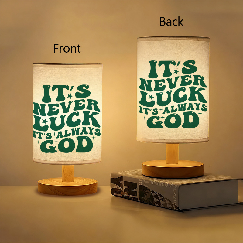 - Inspirational Quote Design: The Inspirational Quote Printed Linen Table Lamp For Home prominently displays the inspiring quote, "It's never luck, it's always God," reminding us that faith plays a key role in everything we do. It’s a perfect message to uplift and inspire.