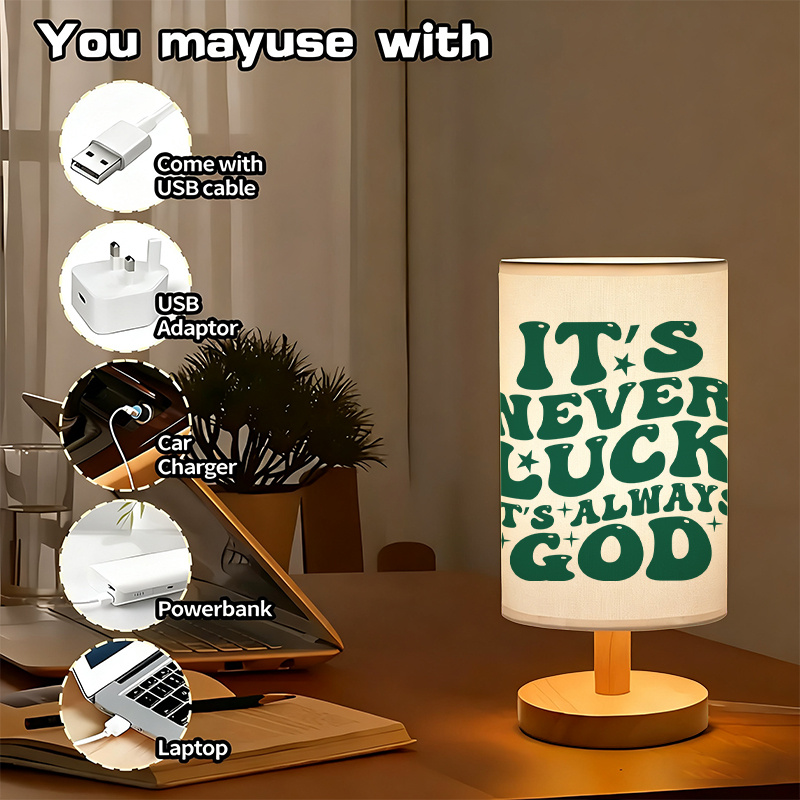 The Inspirational Quote Printed Linen Table Lamp For Home is a meaningful and uplifting addition to your home decor. Featuring the message "It's never luck, it's always God," this lamp offers both light and inspiration. Powered by USB, it’s perfect for creating a peaceful and spiritual atmosphere in any room, whether placed on your bedside table, desk, or side table.