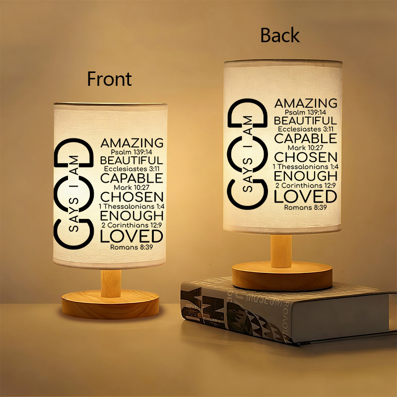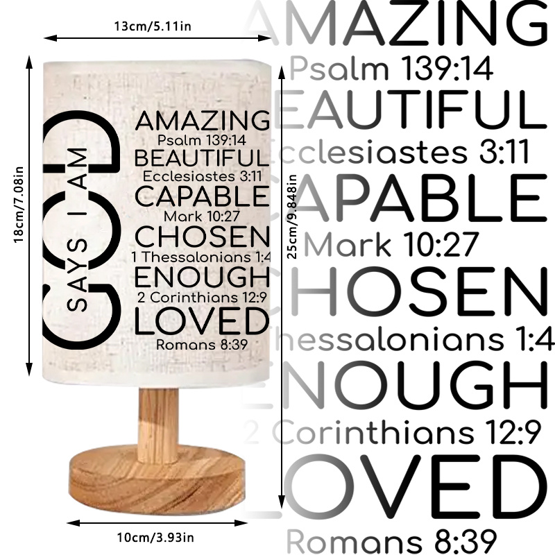 The Inspirational Quote Printed USB Powered Linen Table Lamp is designed to provide steady ambient lighting while displaying meaningful faith-based text. Featuring a linen-style shade and a wooden base, this lamp presents a balanced structure suitable for modern interiors. The printed scripture references are arranged in a clear vertical layout, creating a thoughtful visual element that integrates naturally into daily surroundings.