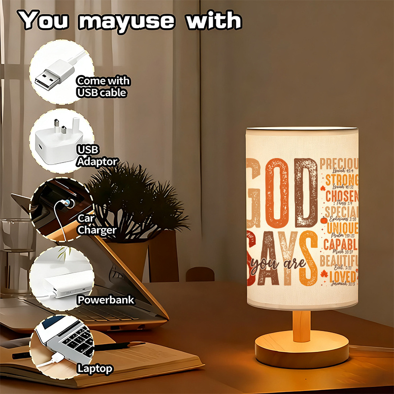- Inspirational quote USB lamp with modern linen shade