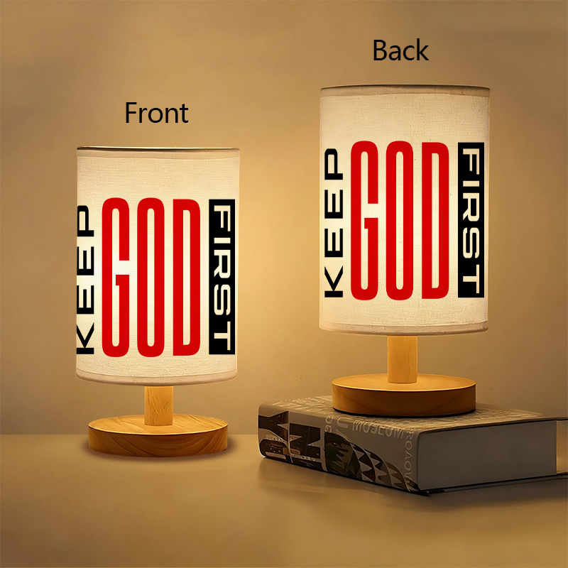 The Keep God First Printed Linen Table Lamp For Home Decor is a USB-powered table lamp featuring an inspirational message and a stylish linen shade. With its bold red and black typography, this lamp serves as a reminder to prioritize God in every aspect of life. Ideal for bedrooms, home offices, or living rooms, it offers both illumination and spiritual encouragement. The wooden base and energy-efficient LED make it a practical, stylish addition to any space.