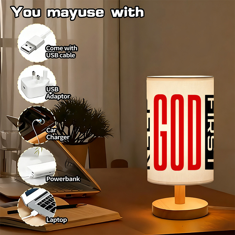 - USB Powered: The Keep God First Printed Linen Table Lamp For Home Decor is USB-powered, offering convenience and energy efficiency. Simply plug it into any USB port—whether from a power bank, laptop, or wall adapter—and enjoy its soft light while being reminded to keep God first in your life.