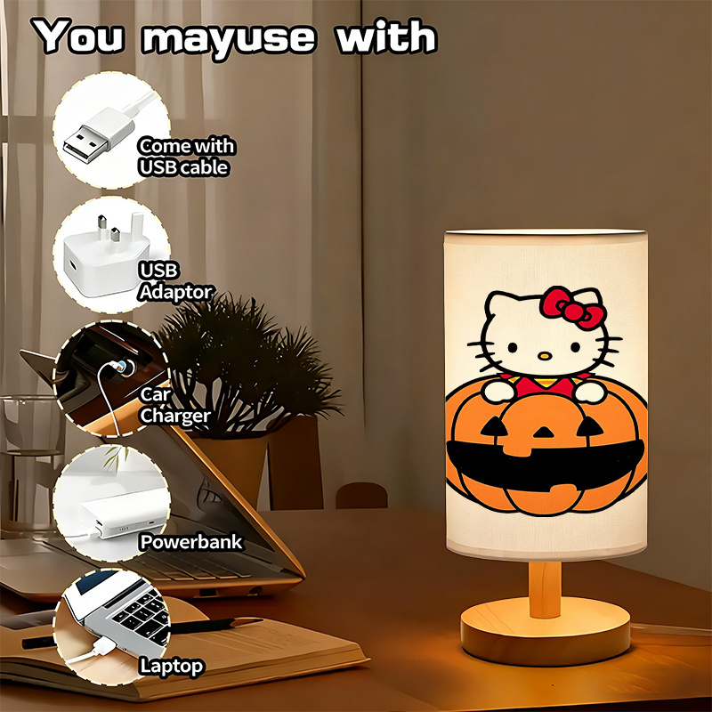 Brighten your child's room with the Kitty Themed LED Linen Table Lamp with Pumpkin Design. This USB-powered table lamp features a Hello Kitty design, providing a soft glow that’s perfect for night or playtime. With its energy-efficient LED light and character, this lamp is ideal for kids' rooms, themed spaces, and as a gift for any Sanrio fan. It’s portable, easy to use, and an addition to any decor.