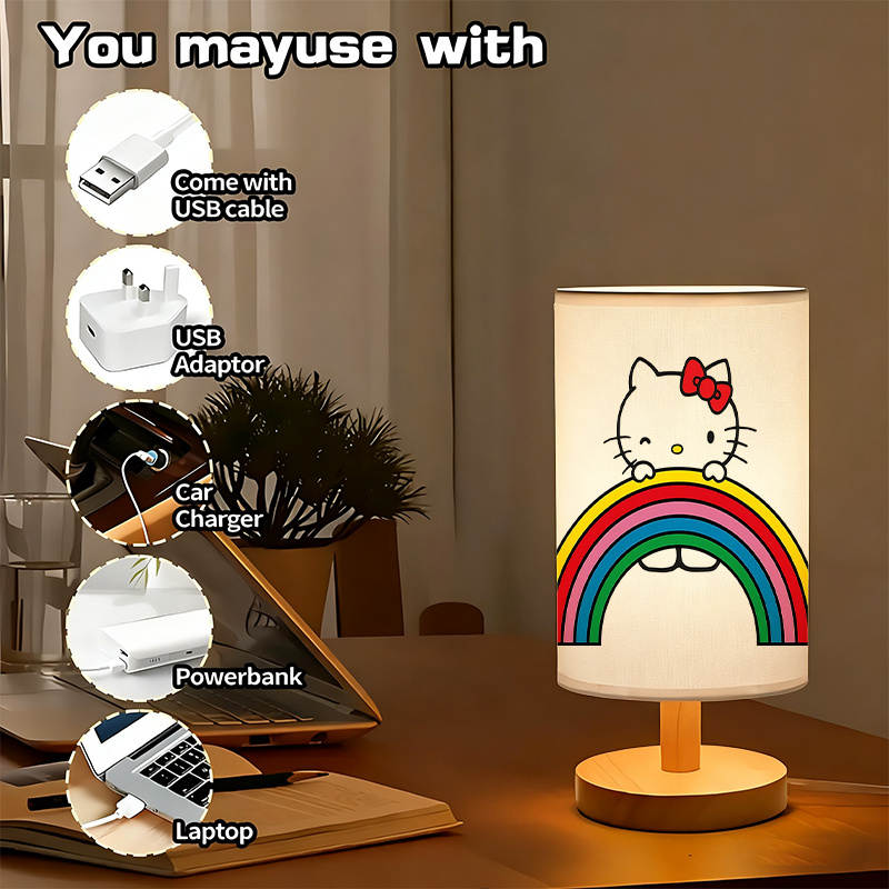 The Kitty Themed Linen Table Lamp With Rainbow Design is the perfect choice for anyone who likes to combine functionality with fun. It brings the Hello Kitty character into your home, while the vibrant rainbow adds an extra splash of color and personality. The USB-powered feature makes it convenient and energy-efficient, and the wooden base ensures stability. Ideal for children's rooms or as an accent piece, this lamp offers a blend of style, convenience, and charm.