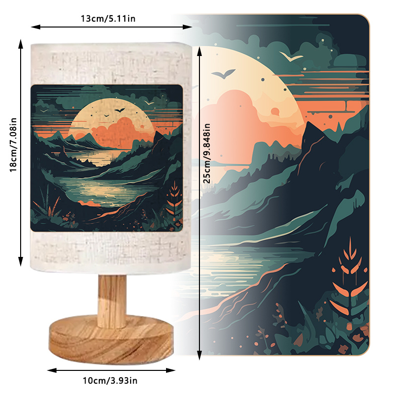 The Landscape Sunset Art Printed Linen Lamp is an indoor lighting accent designed to combine soft illumination with a scenic artwork display. The linen-style fabric shade features a landscape sunset print with mountains, water, and sky elements, bringing a nature-inspired focal point to your room décor. Its modern cylindrical shade sits on a wood-toned base, making it easy to coordinate with common interior finishes such as light wood furniture, neutral tabletops, and simple décor arrangements. This lamp is well-suited for placing on bedside tables, desks, shelves, or console tables where a compact lighting source can also serve as a decorative feature.