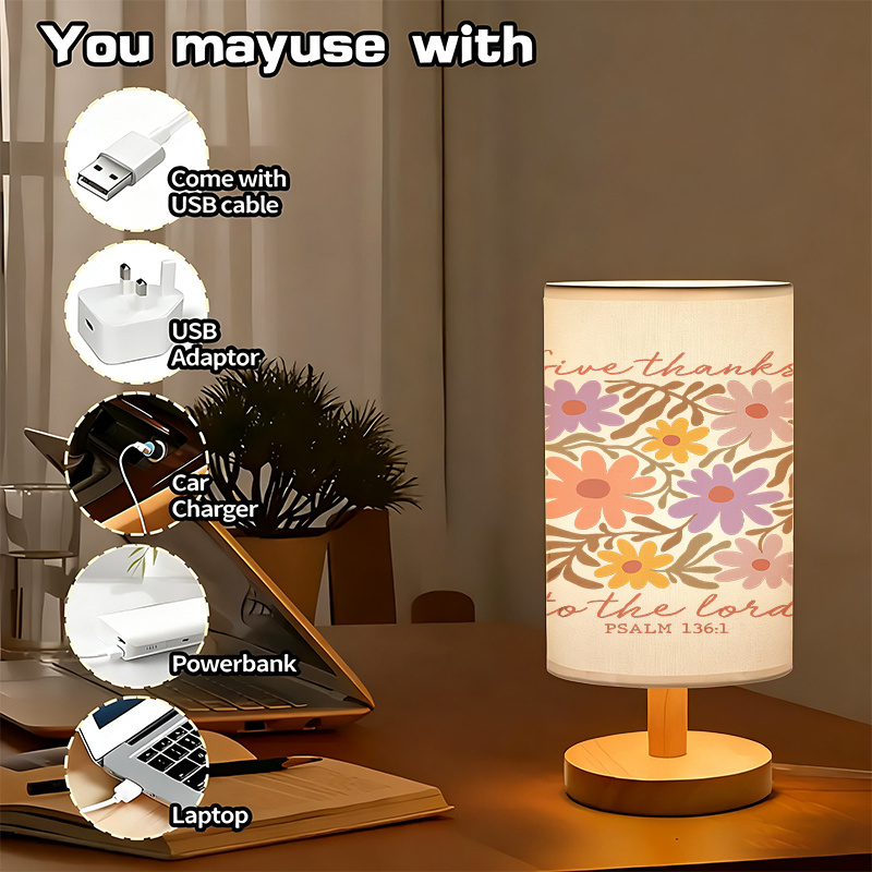 Crafted with linen, this Linen Table Lamp With Inspirational Quote And Flower Print is designed to be aesthetically pleasing. The sturdy wooden base adds a rustic look, making it perfect for both modern and traditional interior styles. Thanks to its USB-powered functionality, you can easily connect it to a variety of devices like power banks, laptop chargers, or even car chargers, offering you versatility and convenience. A great gift for those who cherish faith and beautiful design.
