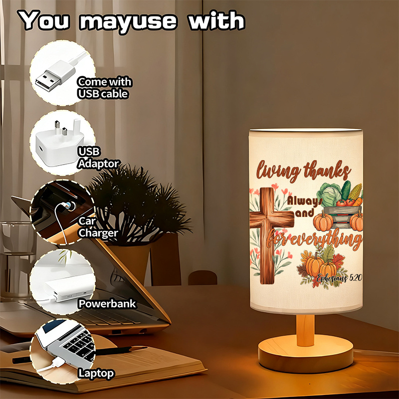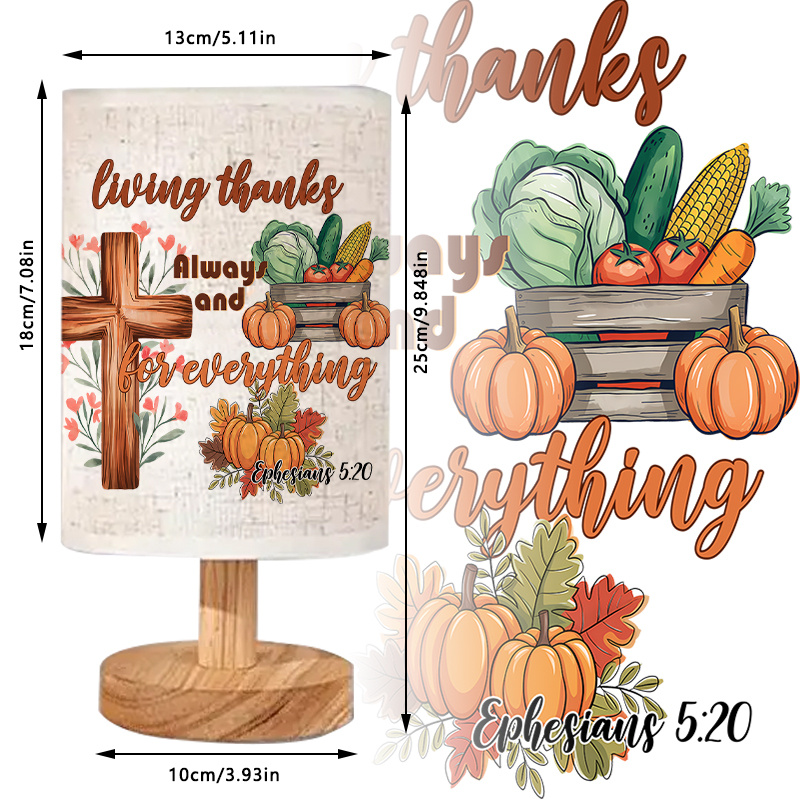 The Living Thanks Message Decor Printed Linen Table Lamp design brings a message-focused look to a modern lamp that fits easily into everyday spaces. The printed shade features a warm seasonal illustration with harvest-style elements and a central wooden-style cross graphic, paired with a gratitude-themed phrase and a scripture reference. The cylindrical linen-style shade keeps the artwork visible from common viewing angles, while the uplight lighting method sends light upward through the fabric for soft ambient illumination. This makes it suitable for quiet evenings, reading corners, and room lighting where you want a gentle glow rather than a direct beam.