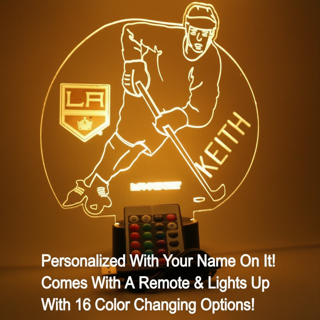 The Los Angeles Kings Custom Hockey Player LED Acrylic Lamp combines a sharp etched acrylic design, custom name and number options, and remote-controlled color modes in one compact display. It’s a simple way to add a rink-inspired to a shelf, desk, or display area while keeping setup and operation straightforward. Choose your customization details, place it where you want it to stand out, and use the remote to set the look that fits your space
