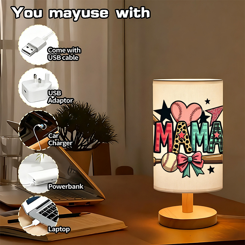This Sports MAMA Print Linen Uplight Table Lamp offers modern décor styling and soft ambient lighting. The sports mom table lamp shade adds a decorative touch to tabletop spaces. The uplight lighting method creates a gentle glow across the room. Push button control keeps operation quick and easy. USB powered setup supports placement in many spaces. Use it in bedrooms, living rooms, dorm rooms, and study areas for reading and room ambiance.