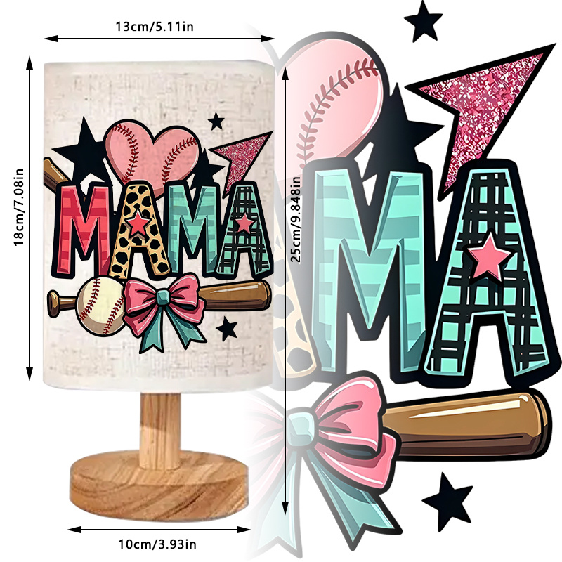 Add modern décor style and soft lighting to your space with this MAMA Printed Linen Table Lamp With Stars And Sports Design. It features a linen shade with a sports mom table lamp print design. The artwork includes sporty icons and bold lettering. This creates a statement décor piece for desks and side tables. The linen shade decor light texture adds a warm and refined tabletop look.