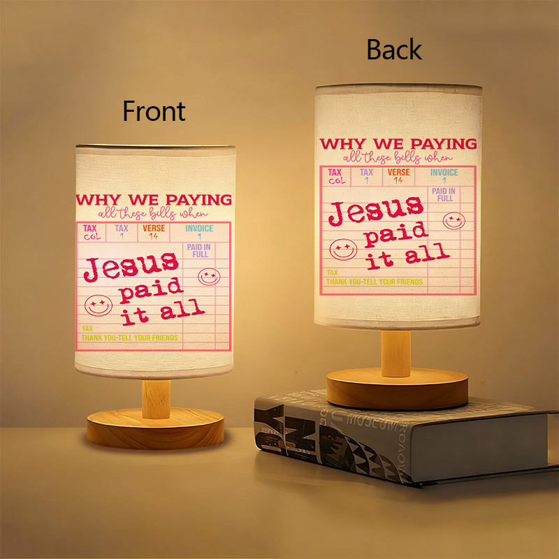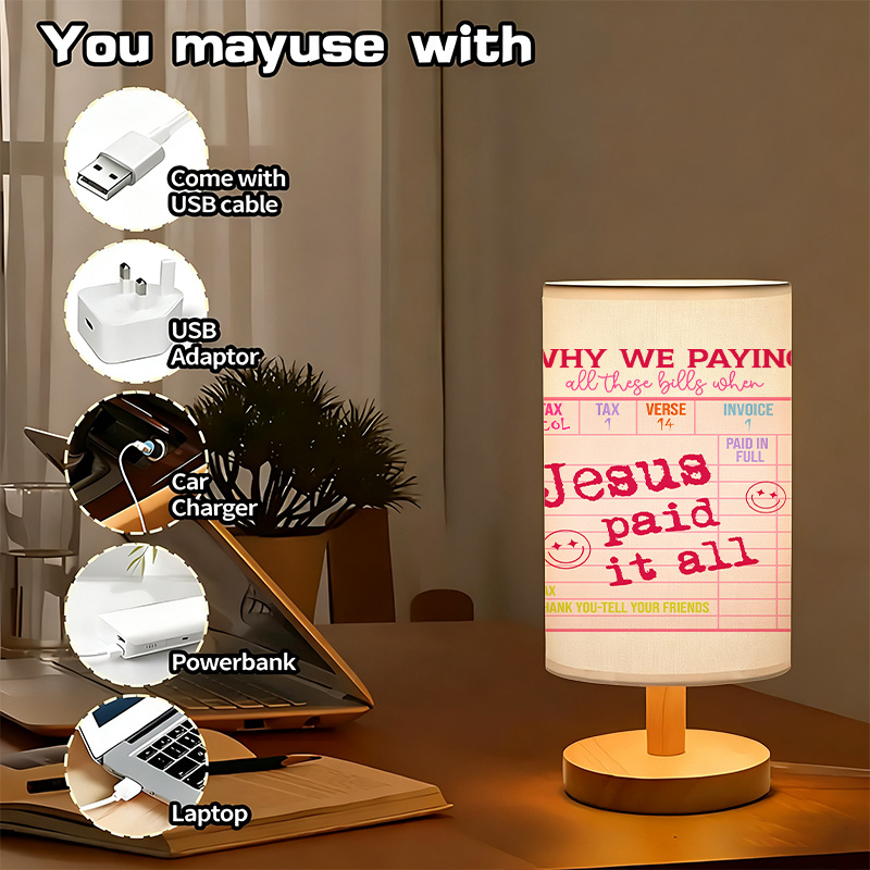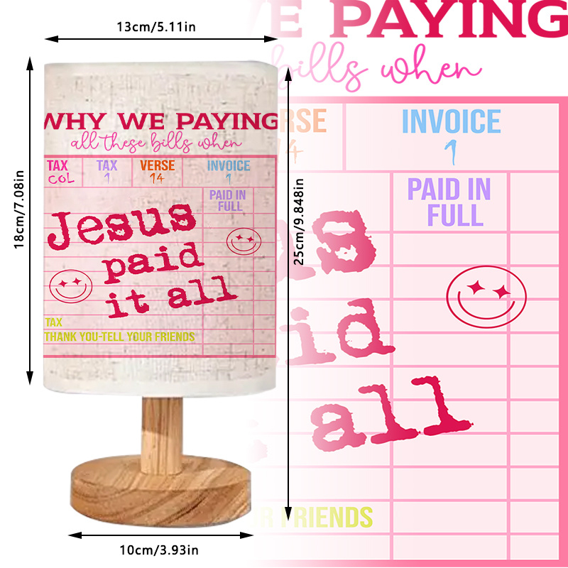 The shade includes visible message text styled in clear layout. The wooden base provides balance and prevents tipping on flat surfaces.