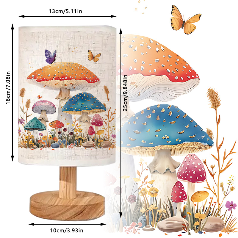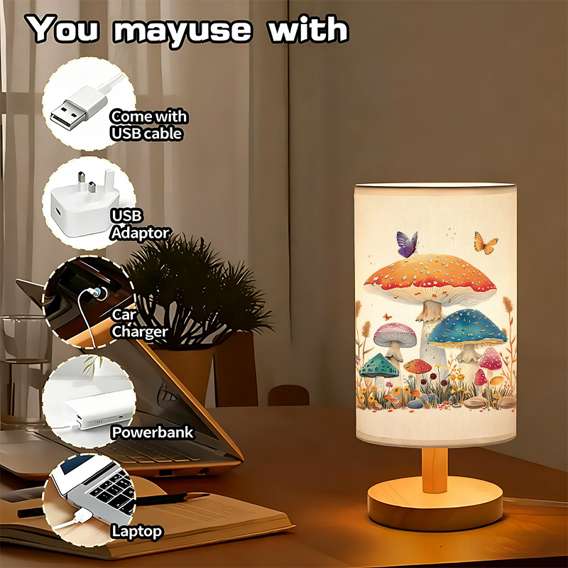 Mushroom Pattern Linen Table Lamp is an indoor tabletop lamp designed for placement on nightstands, desks, side tables, and shelves. It uses a USB power connection, which supports flexible setup near common power sources such as wall adapters, power strips, and desktop USB ports. The lamp shown includes a linen-style shade with a creative printed pattern featuring illustrated mushrooms and small butterflies, paired with a round base that supports steady placement on flat surfaces. The overall format keeps the lamp profile compact while adding a decorative printed element that fits themed interior styling.