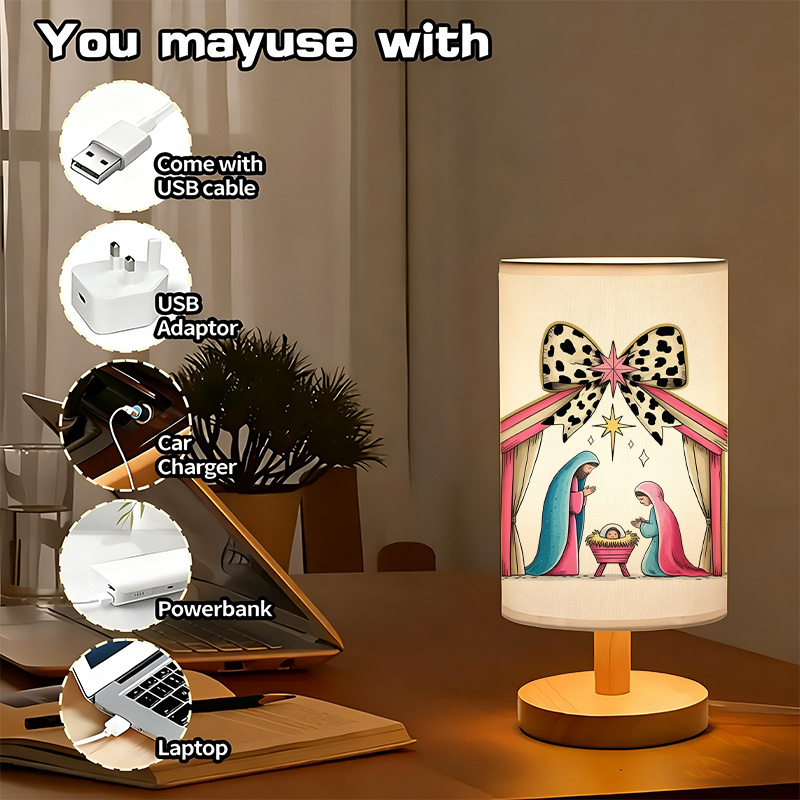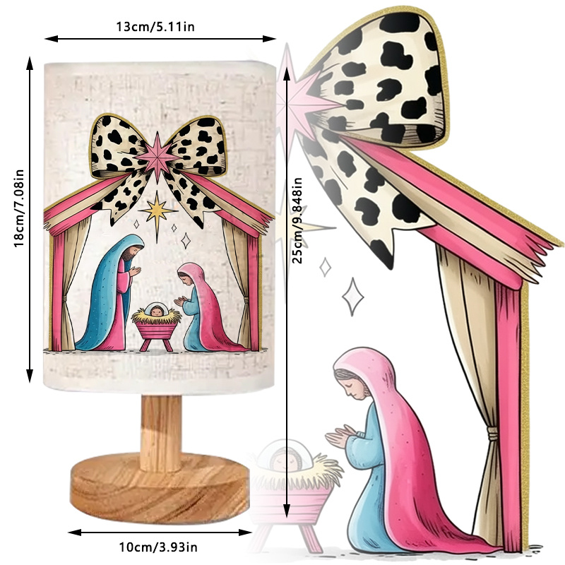 The Nativity Scene Printed Linen Table Lamp With Bow Artwork is created for seasonal settings that favor warm lighting, thematic design, and structured materials. This lamp features a cylindrical printed shade and a balanced wood base, designed to remain upright and functional across various spaces.