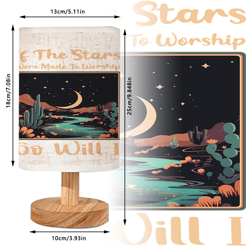 This Night Sky Print Linen Table Lamp brings a gentle glow to your room. The printed shade features a scenic night sky design. The artwork includes stars, a moon, and landscape details. The uplight lighting method spreads light upward for a calm effect. This lamp supports ambient lighting for reading and quiet evenings.
