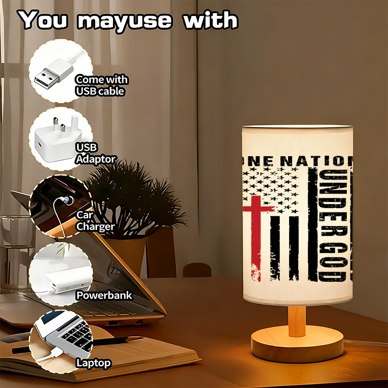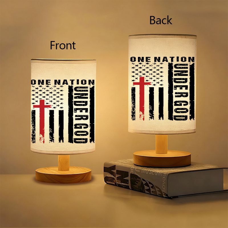 This One Nation Under God Message Printed Table Lamp With Wooden Base is crafted with attention to form and placement. The printed message design on the fabric shade is centered around a statement combined with a graphic pattern that reflects a symbolic theme. The wooden base complements the upper print with a neutral structure, giving the lamp balance on any flat surface.