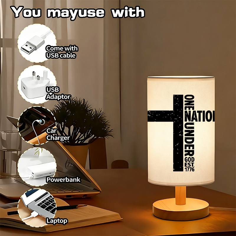 The One Nation Under Print With Text Linen Table Lamp is a versatile lighting option for contemporary interiors. Featuring a printed fabric shade, wooden base, USB-powered setup, and included light source, it fits naturally into bedrooms, living rooms, and reading areas. Its balanced design makes it suitable for decorative display as well as everyday indoor lighting needs.