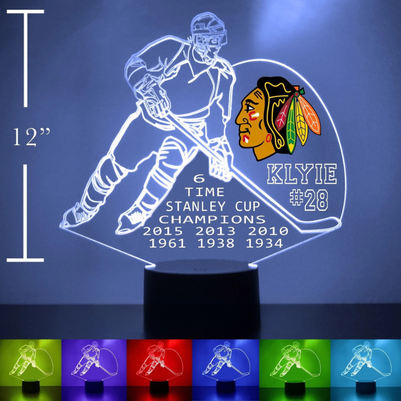 The Personalized Chicago Blackhawks Themed Hockey Player Design LED Lamp is a tabletop lighting display crafted using precision-engraved acrylic and LED edge-light technology. The engraved panel features a dynamic hockey player pose combined with optional personalized text and number details. Although the acrylic panel itself is flat, the illuminated engraving creates a three-dimensional illusion when powered on.
