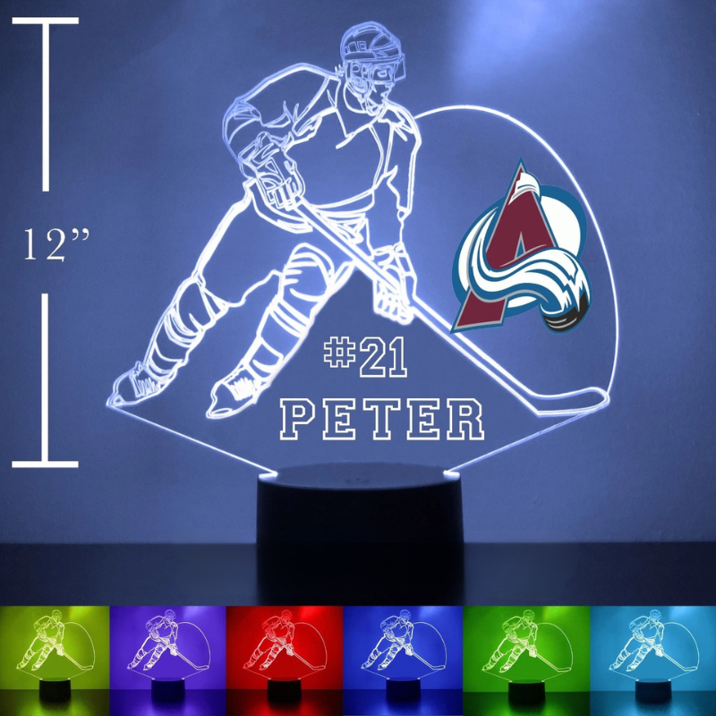 The tabletop design requires no mounting or installation. The Personalized Colorado Avalanche Football Themed LED Night Lamp is an indoor tabletop light featuring a hockey player illusion design with customizable name and number engraving. It combines engraved acrylic construction with LED lighting and multiple color options, making it suitable for display areas, desks, and indoor decorative spaces.