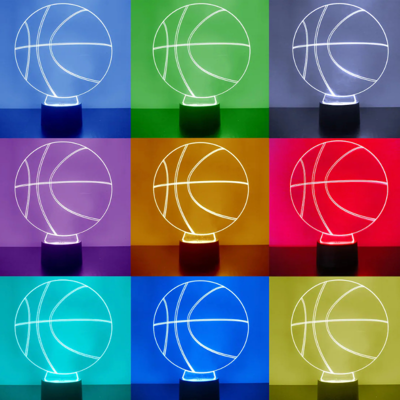 The engraved basketball-style outline creates a clean sports theme that stands out as décor even when the base lighting is not switched on.