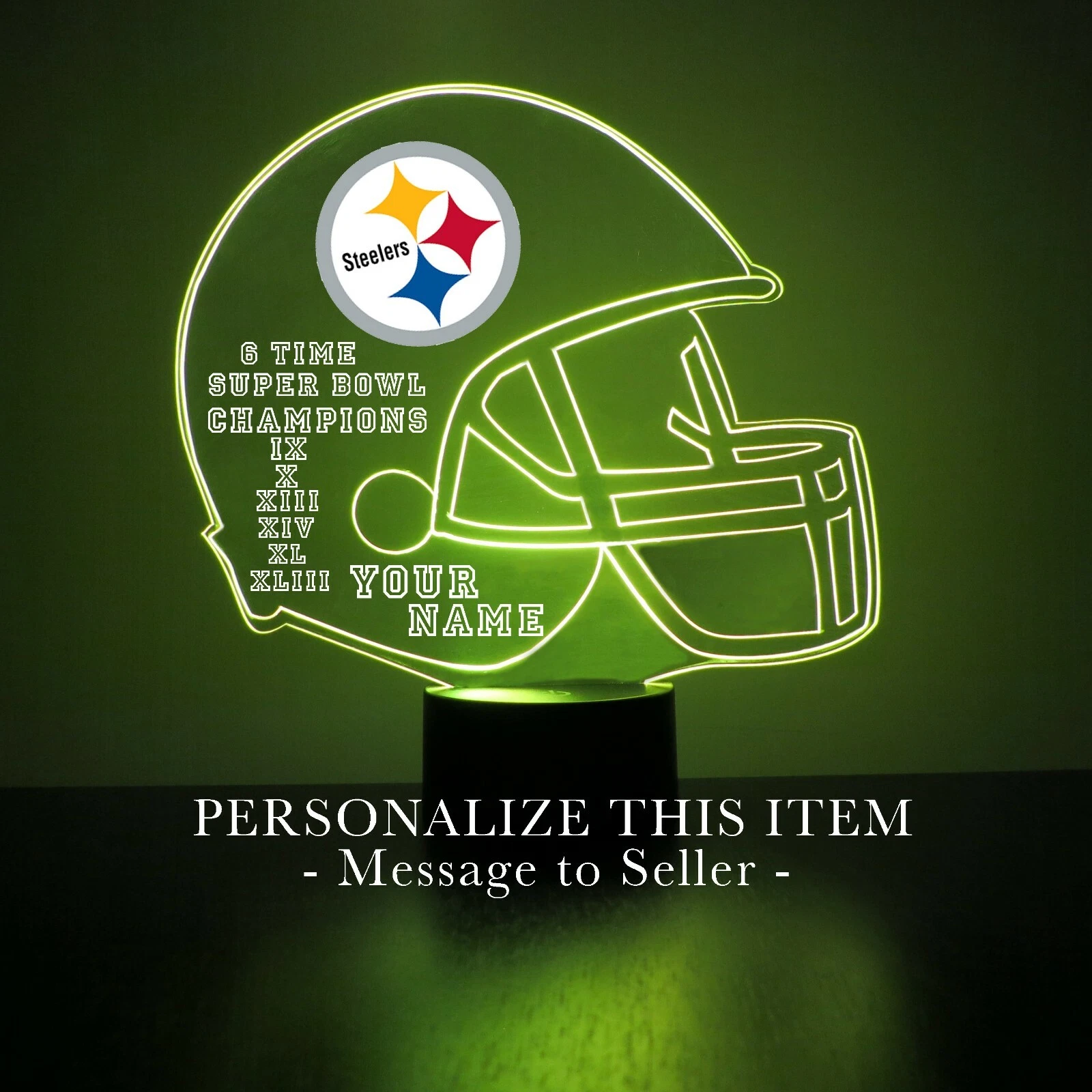 The Personalized Pittsburgh Steelers Football Themed Acrylic LED Lamp offers a clean and structured appearance that fits easily into sports-themed interiors, hobby spaces, or display collections. Its compact size allows it to function as an accent light without occupying excessive space.