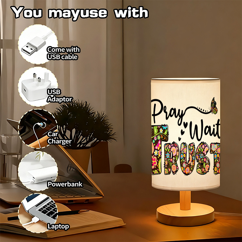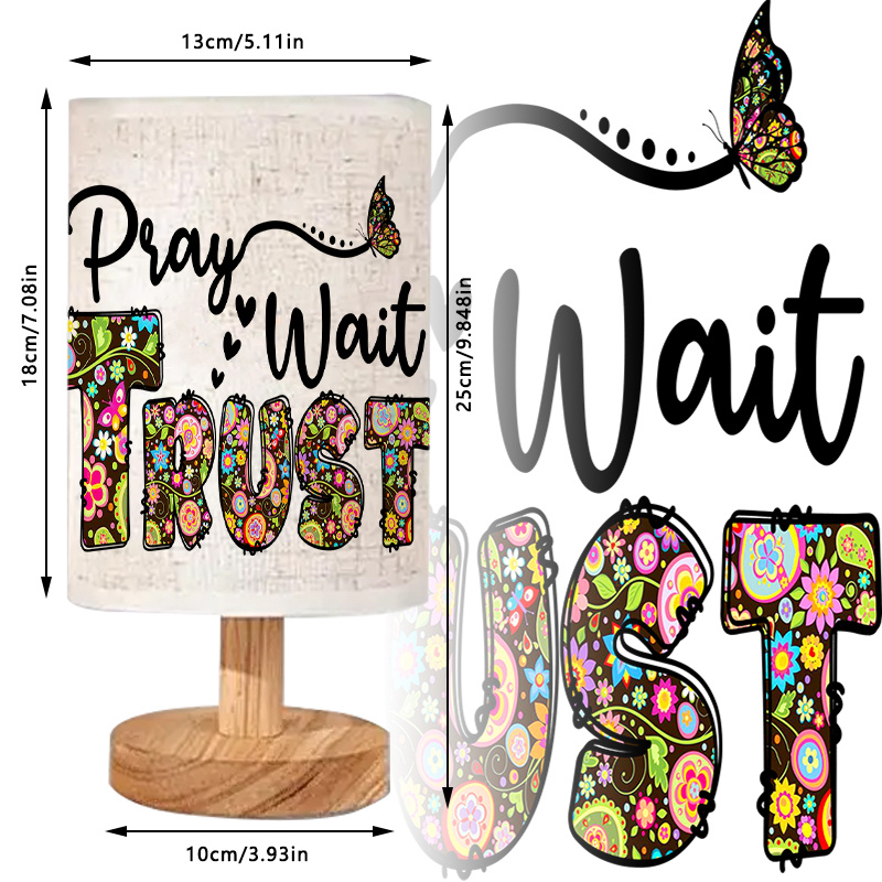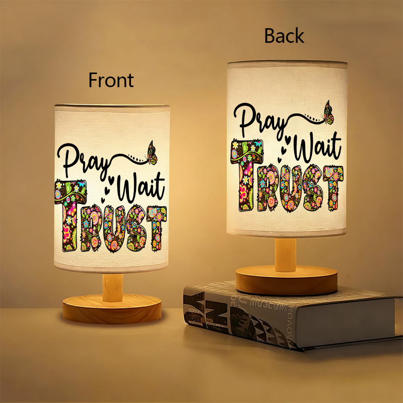 The Pray Wait Trust Words Printed Linen Table Lamp is created for seasonal settings that favor warm lighting, thematic design, and structured materials. This lamp features a cylindrical printed shade and a balanced wood base, designed to remain upright and functional across various spaces.