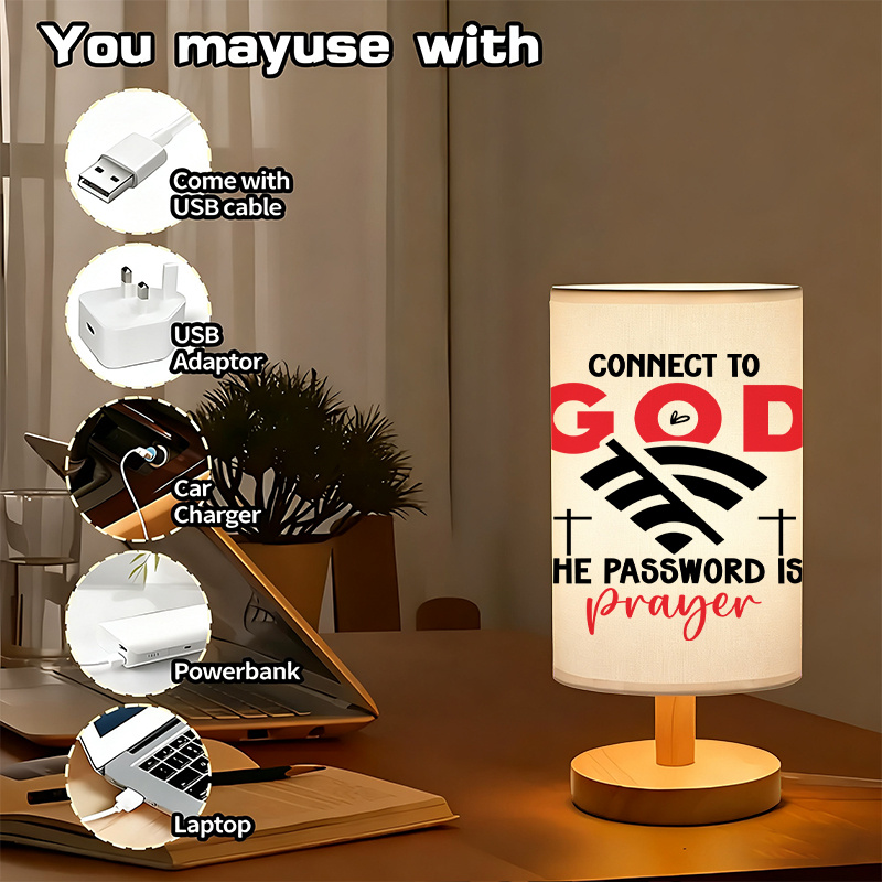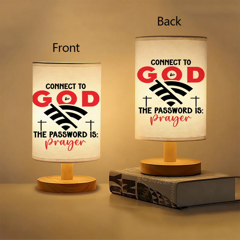 The Connect To God Printed Linen Table Lamp For Decor features the inspiring message "Connect to God, The Password is: Prayer," creating a meaningful and positive atmosphere. USB powered for convenience, it provides a soft, warm glow, perfect for any room, office, or spiritual space. Its compact design linen fabric make it an ideal choice for small spaces. It also makes a great gift.