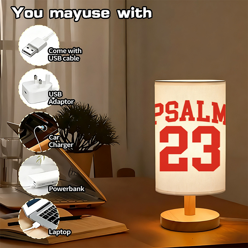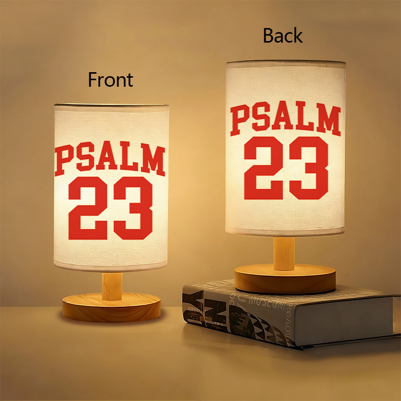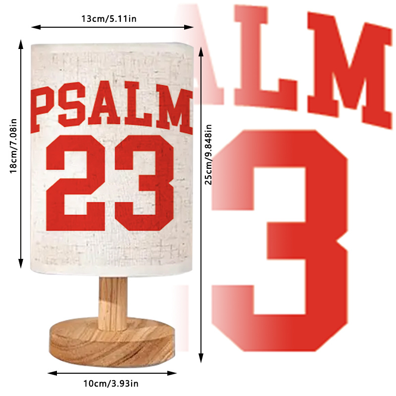 The Psalm 23 Printed Linen Table Lamp Decor is an indoor table lighting option designed to provide usable illumination while adding a text-based design element to your space. This version features a linen-style shade with “Psalm 23” printed in large, bold lettering, creating a clear focal point that is easy to read from across a room. The shade material helps diffuse the light output, and the uplight lighting method directs illumination upward to support a calm, even glow around the lamp. Designed for placement on desks, side tables, shelves, and consoles, it fits a wide range of indoor room types and common furniture layouts. Operation is handled through a button switch and push-button control, keeping daily use straightforward. The lamp includes a light source and is designed to operate without a battery, making it suitable for consistent use in a fixed location.