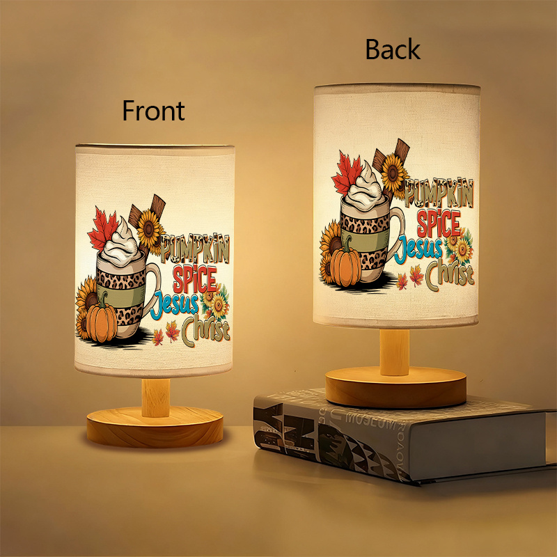 This Religious Fall Decor Table Lamp With Pumpkin Spice And Sunflower Art features a seasonal layout combining autumn motifs with religious art. Designed for indoor use, it displays a printed illustration showing pumpkin spice elements, sunflowers, fall leaves, and text centered around Christian themes. The lamp functions as accent lighting for various interior spaces such as workstations, reading corners, or quiet areas that benefit from warm ambient light.