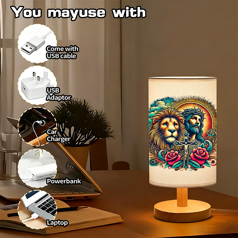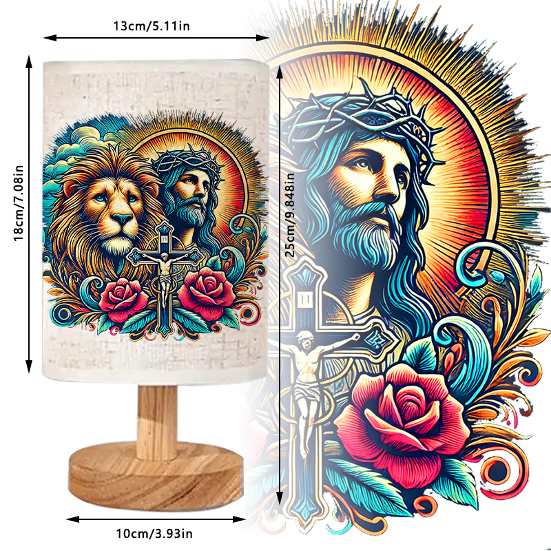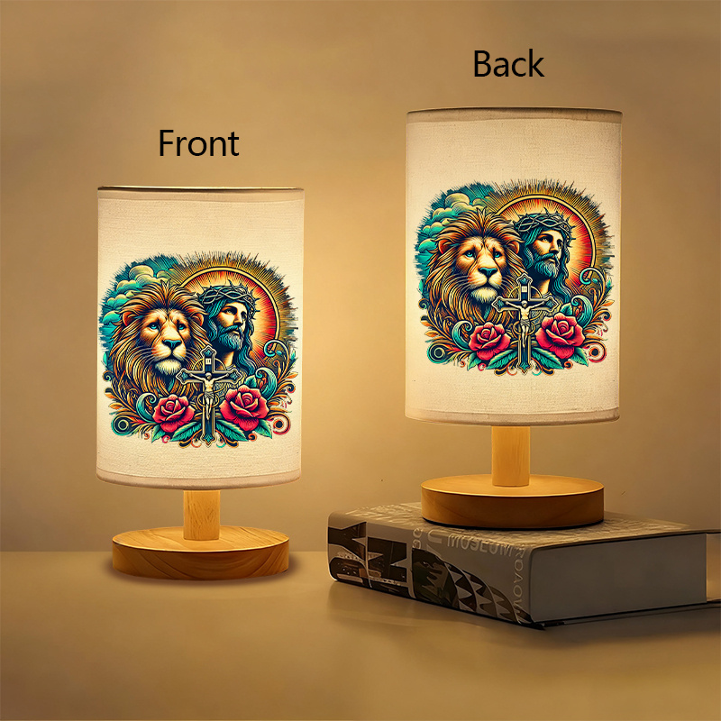 The Religious Lion Printed Table Lamp For Home Decor is a printed lighting piece suited for decorative use in quiet spaces. Designed for surface placement, it includes religious artwork that features symbolic characters and meaningful patterns. The printed lampshade showcases detailed visuals including a lion, cross, and floral elements, providing a consistent theme suited for interior styling with reflective intention.