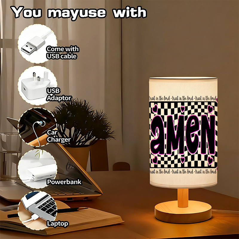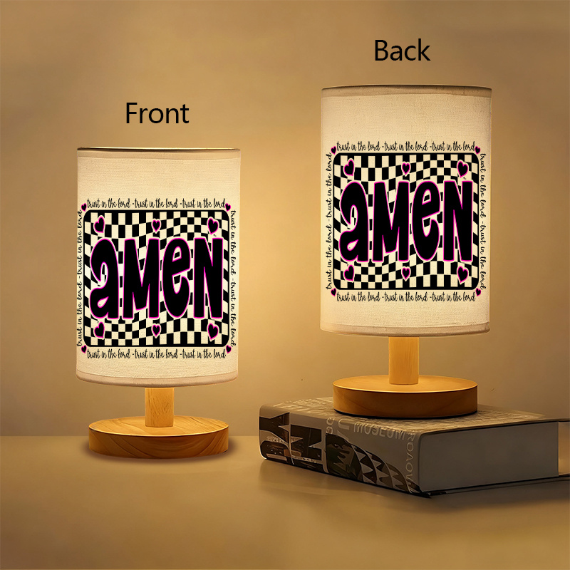 The Religious Scripture Printed Linen Table Lamp For Decor is a bold and faith-centered decorative light designed to uplift and inspire daily life. Featuring the word “Amen” set against a striking checkered background with accents and repeated scripture-style text, this lamp makes a meaningful statement while offering soft, comforting illumination.