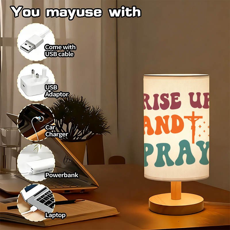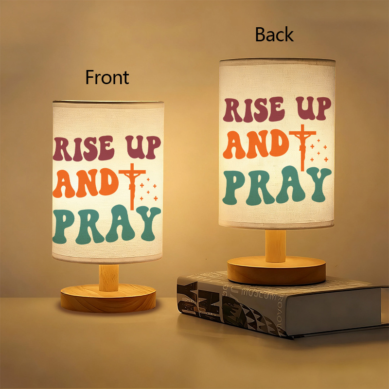 The Rise Up And Pray Inspirational Table Lamp With Faith Message provides ambient indoor lighting combined with a thematic quote designed to support peaceful focus or reflection. Its cylindrical form displays a prominent script across the shade, designed to serve as a gentle reminder for those seeking thoughtful atmosphere in personal or shared settings.