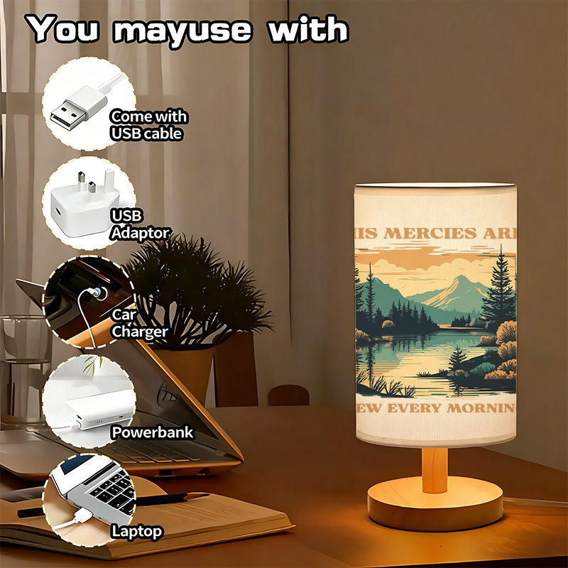 - USB linen uplight lamp with scenic quote printed shade design
